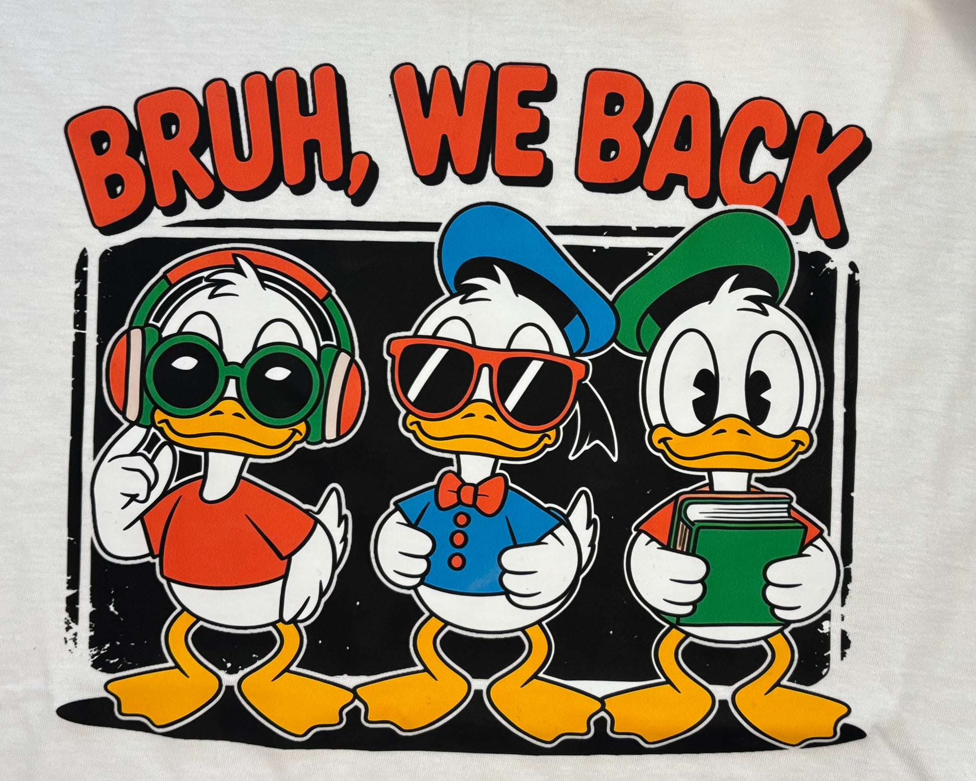 Direct to film design of 'Brah, We Back' on Gildan name brand T-shirt. This design is placed on the front of the shirt. The shirt that is used for the pictures is a Gildan large, white, toddler heavy cotton T-shirt.