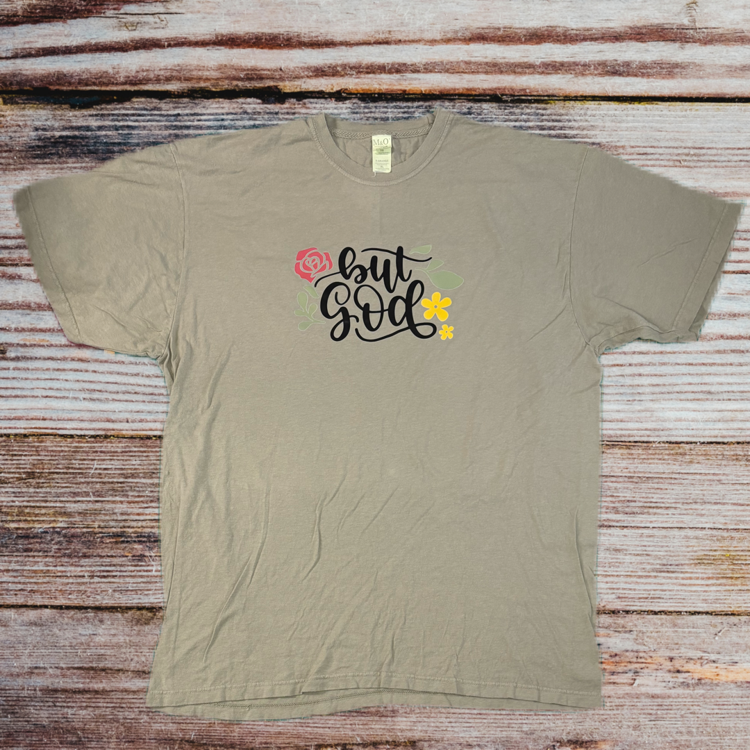 Direct to film design of 'But God' on M&O name brand T-shirt. This design is placed on the front of the shirt. The shirt that is used for the pictures is a M&O extra large, sandstone, unisex vintage garment-dyed T-shirt.