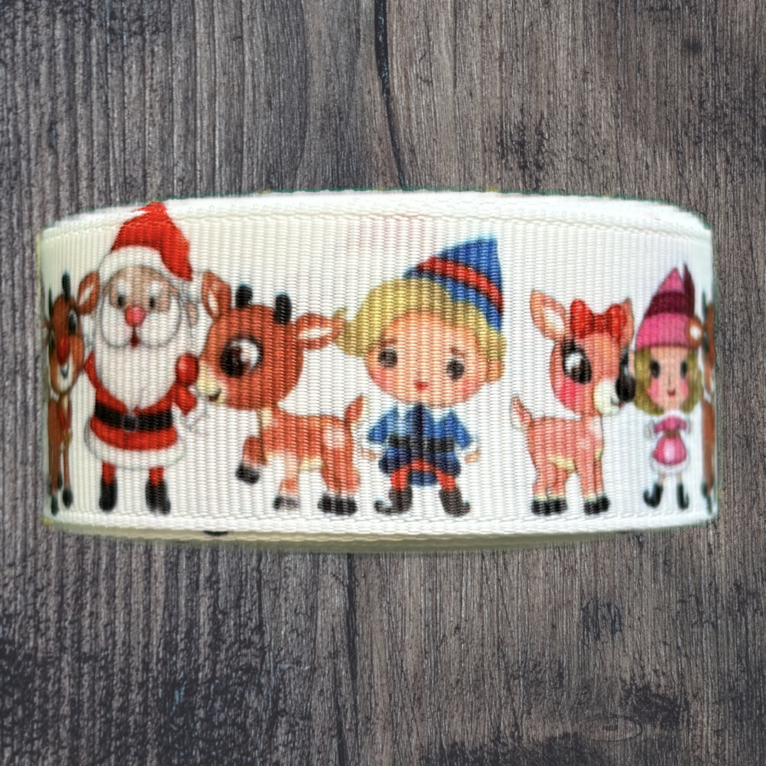 Christmas character grosgrain 25mm ribbon. Non-wired and woven edge. Perfect for crafts of all sorts or making bows.