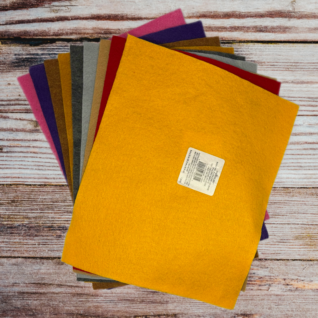 Creatology Mixed basic felt sheets 9” x 12”. This pack is 9 colours, one of each colour shown. There are 2 purple sheets and 2 pink sheets. There are 11 sheets in total.