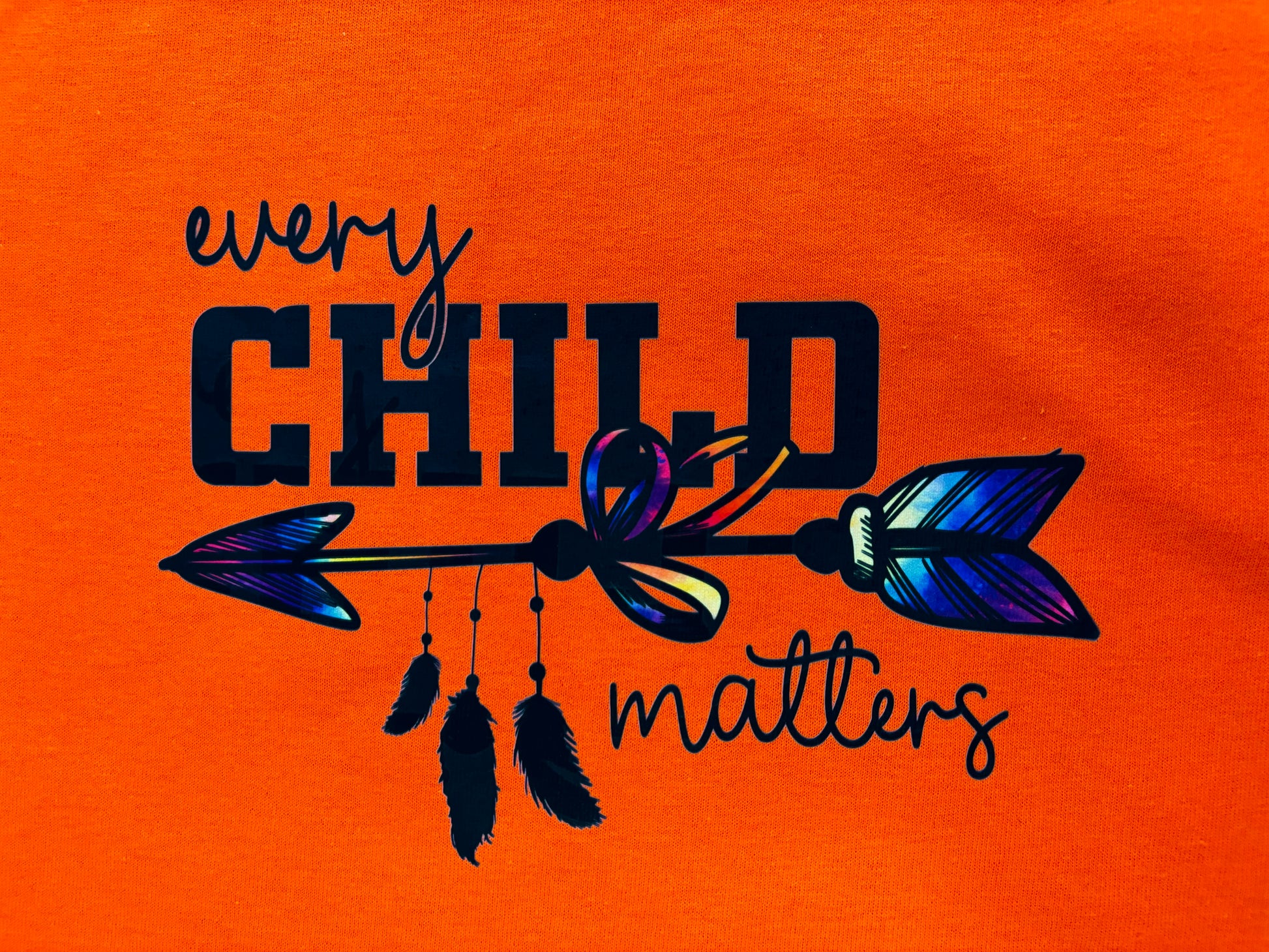 Direct to film design of 'Every Child Matters' Arrow design on Gildan name brand T-shirt. This design is placed on the front of the shirt. The shirt that is used for the pictures is a Gildan small, orange, women's heavy cotton T-shirt.