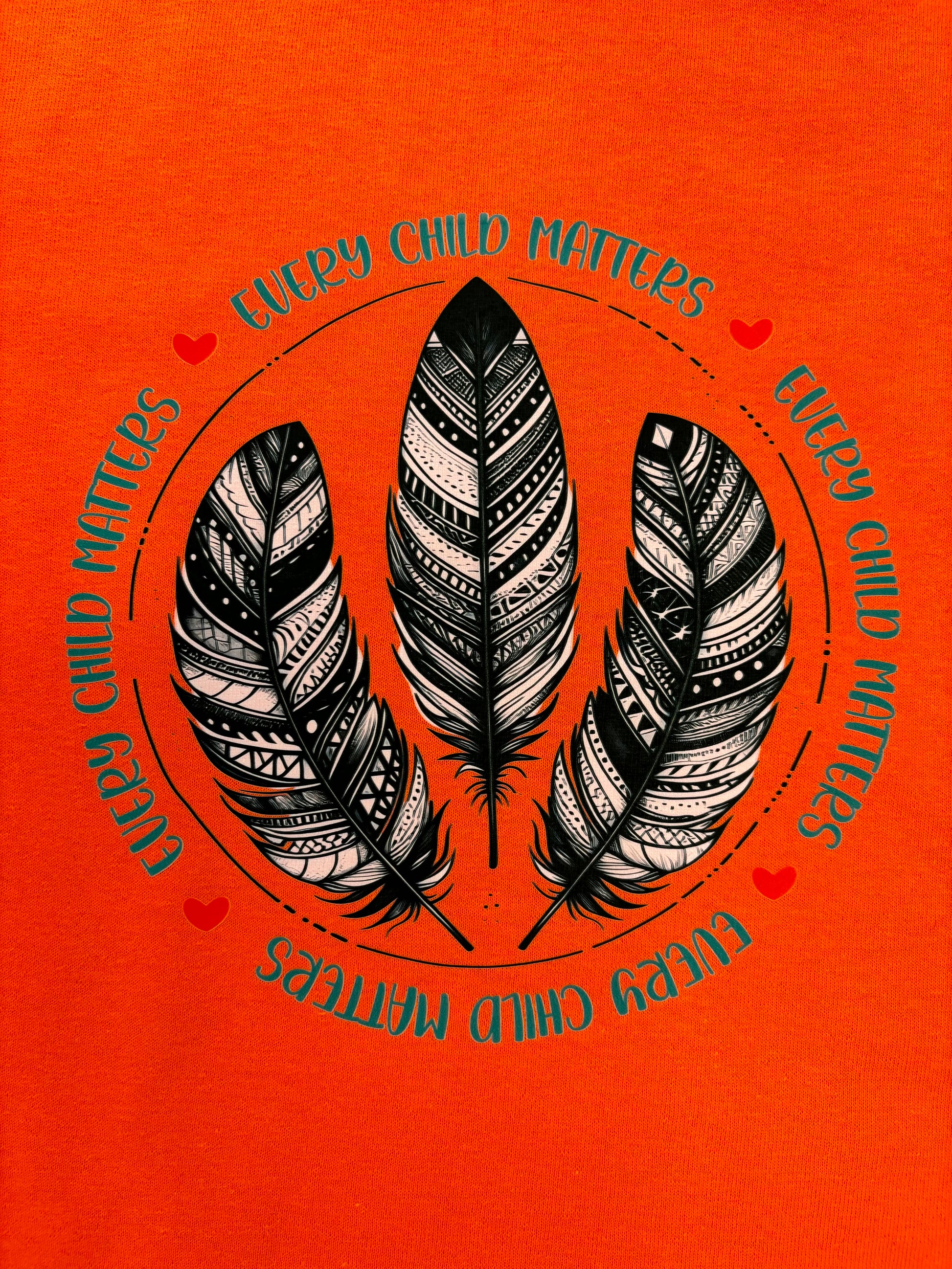 Direct to film design of 'Every Child Matters' Feathers design on Gildan name brand T-shirt. This design is placed on the front of the shirt. The shirt that is used for the pictures is a Gildan small, orange, women's heavy cotton T-shirt.