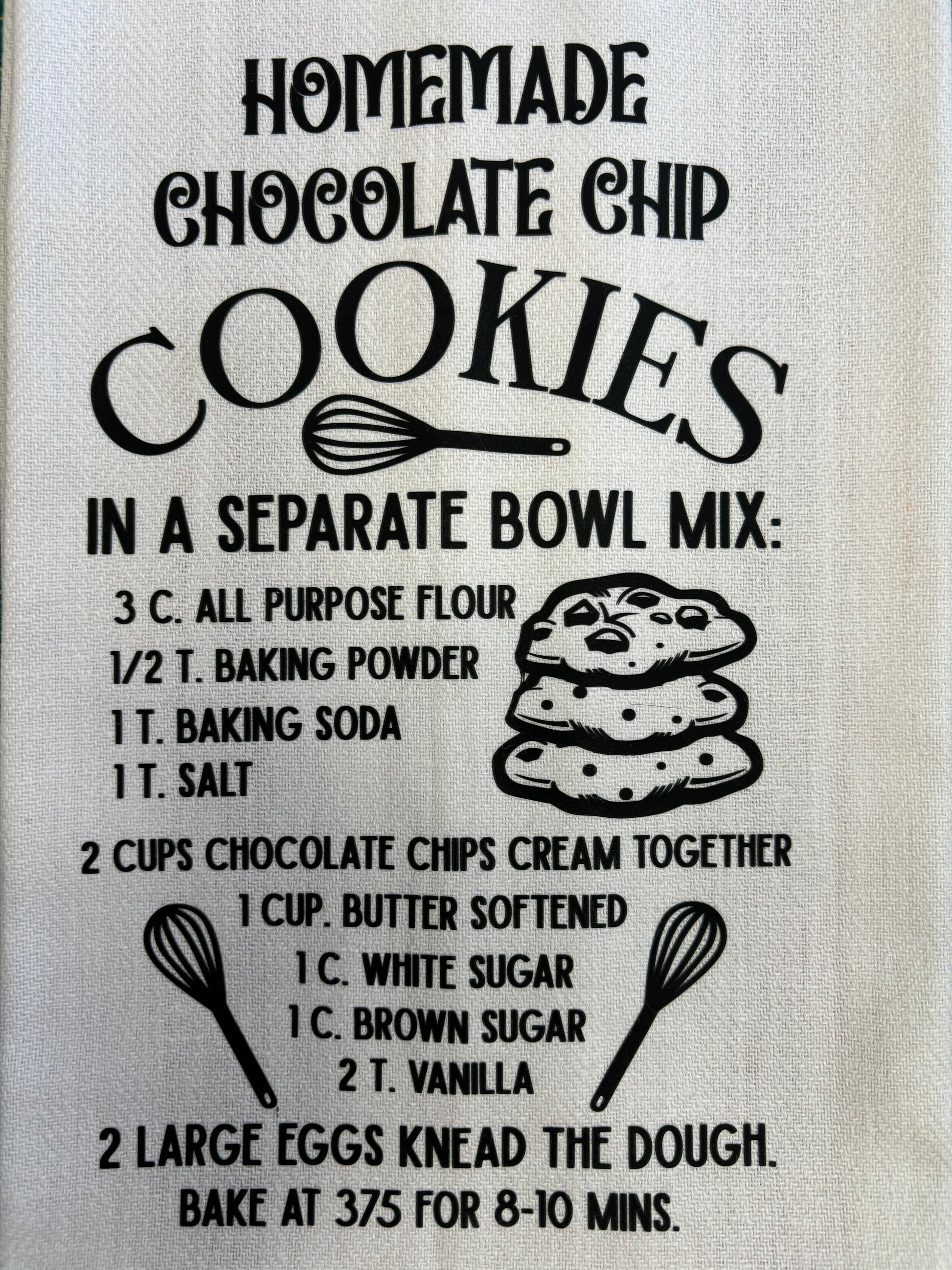 Direct to film design 'Homemade Chocolate Chip Recipe' design on white tea towels with red or green stripe on both the long sides of the towel. This tea towel comes in both coloured and black print.