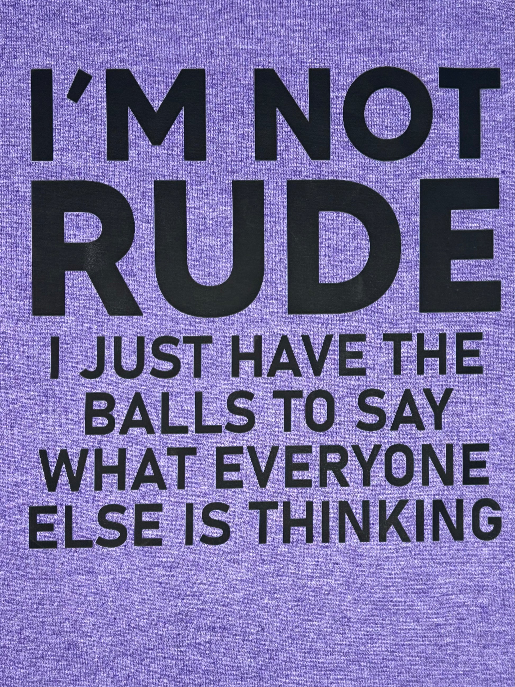 Direct to film design of 'I'm Not Rude' on Gildan name brand T-shirt. This design is placed on the front of the shirt. The shirt that is used for the pictures is a Gildan medium, Heather purple, women's softstyle T-shirt.