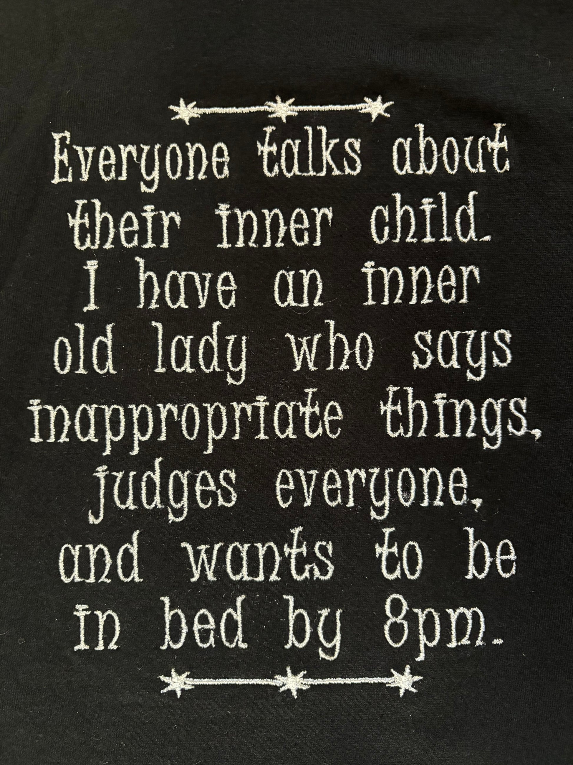 Embroidered design of 'Inner Old Lady' on Gildan name brand T-shirt. This design is placed on the front of the shirt. The shirt that is used for the pictures is a Gildan extra extra large, black, women softstyle T-shirt.