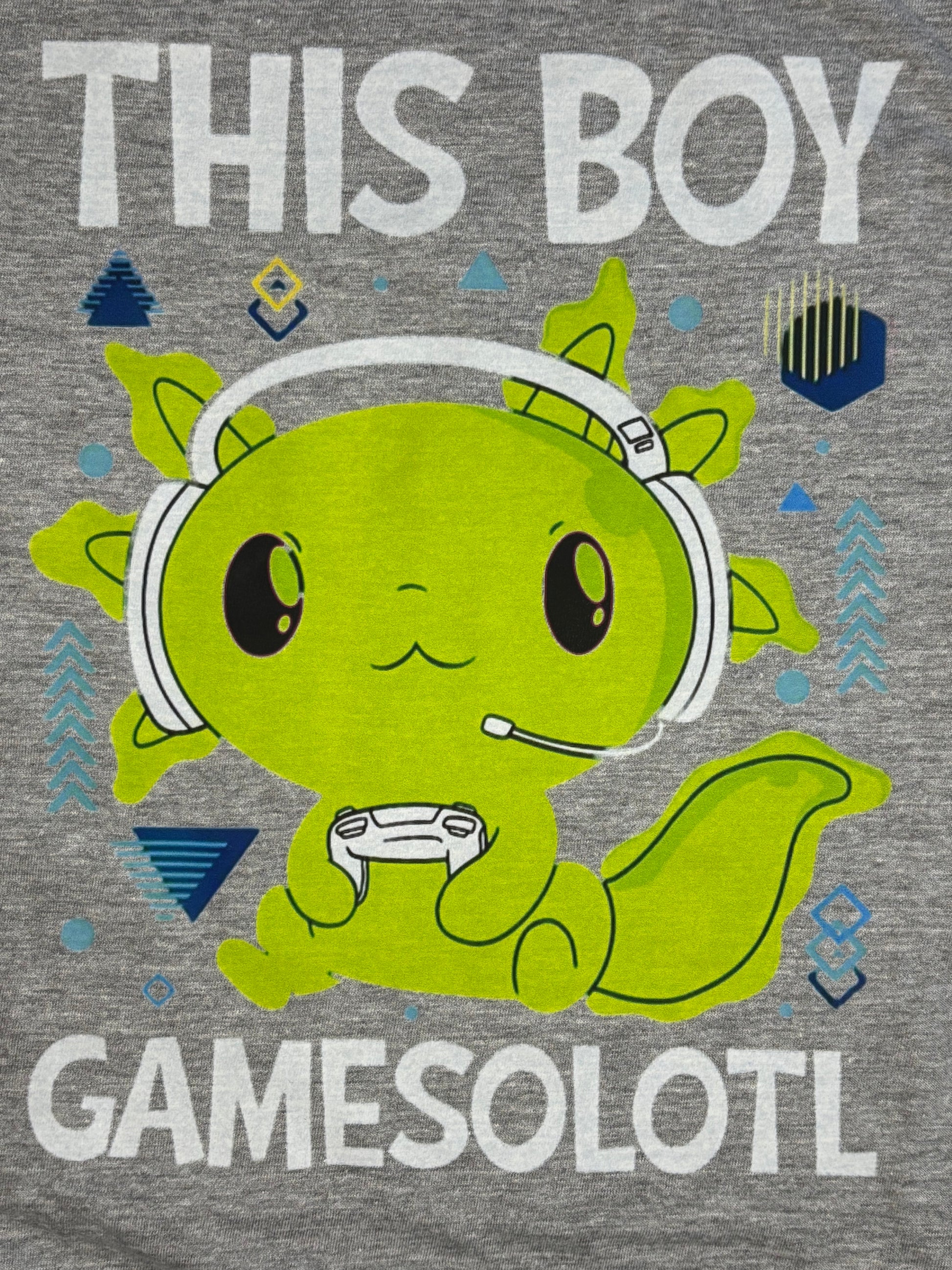 Direct to film 'This Boy Gamesolotl' on Gildan name brand T-shirt. This design is placed on the front of the shirt. The shirt that is used for the pictures is a Gildan large, sport grey, youth softstyle T-shirt.